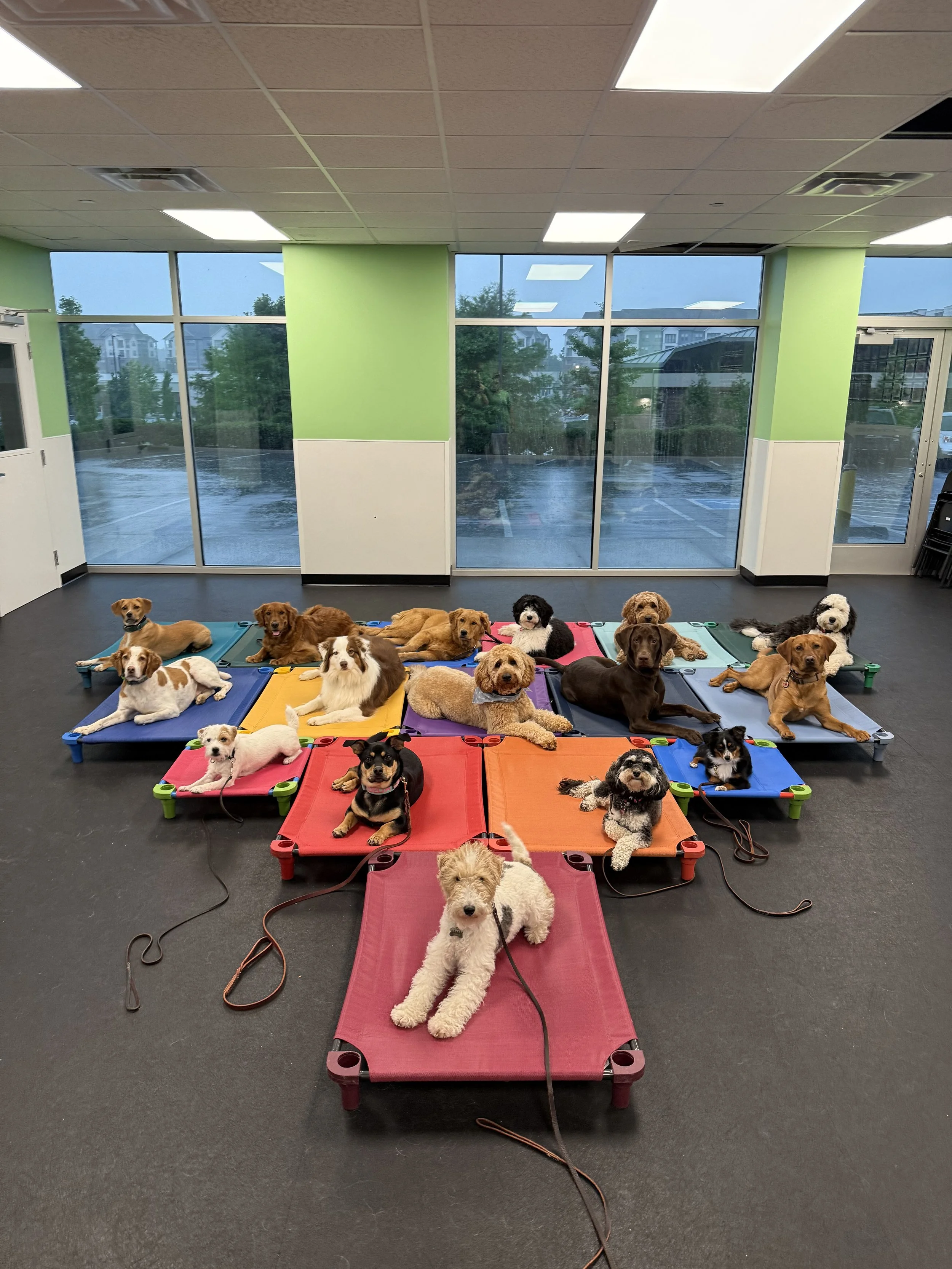 Training Environment - Days are spent on leash walks, one-on-one training, group training, monitored off-leash play and crated nap time. Your dog will spend multiple sessions doing each activity thought out the day. We have a separate calm crating area. Crate time gives the dogs time to rest between activities, as well as ensuring that the trainer is able to focus on each dog individually during their training sessions.